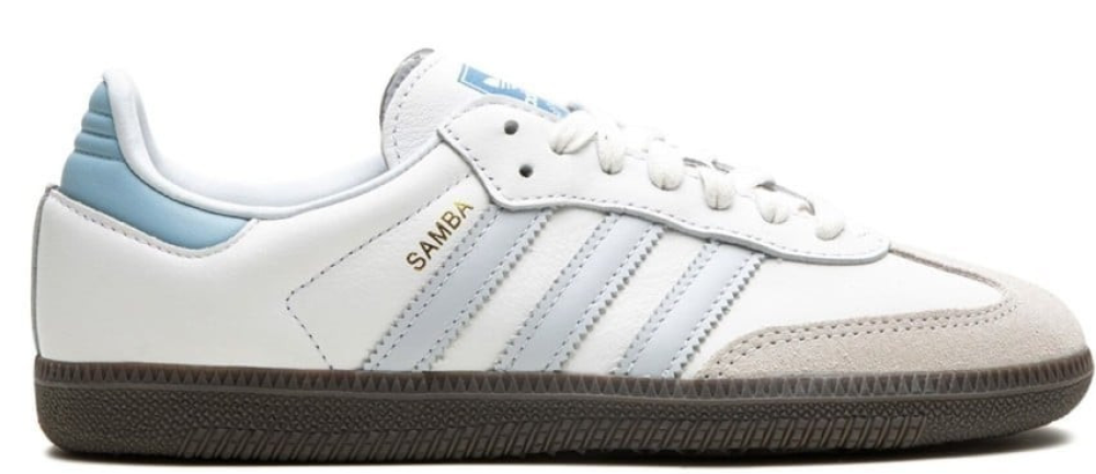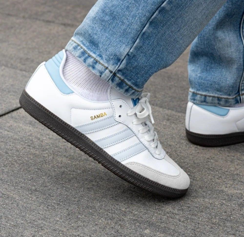 تم إصدار حذاء Samba من أديداس لأول مرة في عام 1950، وقد تم تصميمه ليوفر الثبات. هذا الإصدار مصنوع من الجلد الأبيض مع توقيع باللون الأزرق الفاتح بثلاثة خطوط مسننة على الجدار الجانبي. إنها مثبتة فوق النعل الخارجي المطاطي التقليدي